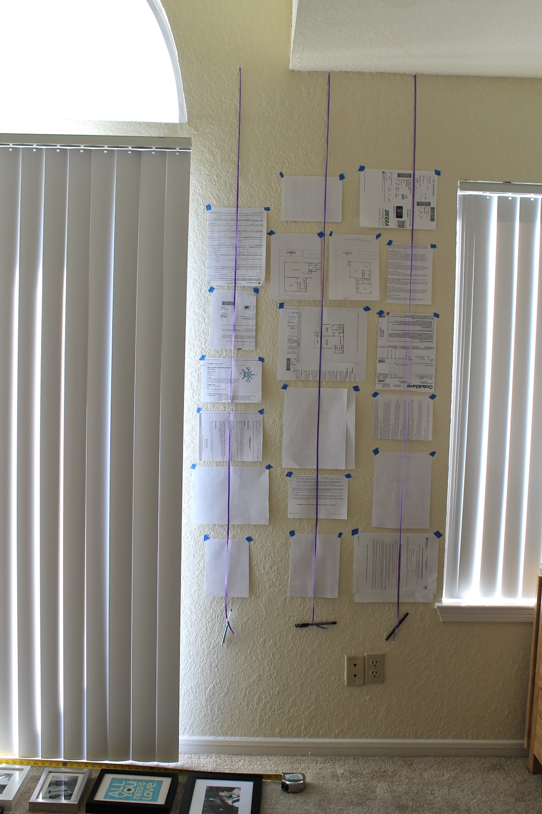 Now that we are mostly unpacked, it's time to get our (huge, diverse accumulation) of art on the walls. I've had a collection of small photos, cards, and mementos since before Mr Official Taster came along, and it's grown and evolved along with my life. Normally, I do a general layout on the floor and then just guestimate their position on the wall. However, this time I was hanging them in a small space, so I wanted to make sure they would all fit. So I went the OCD route, and I thought I'd share in case you want to as well.